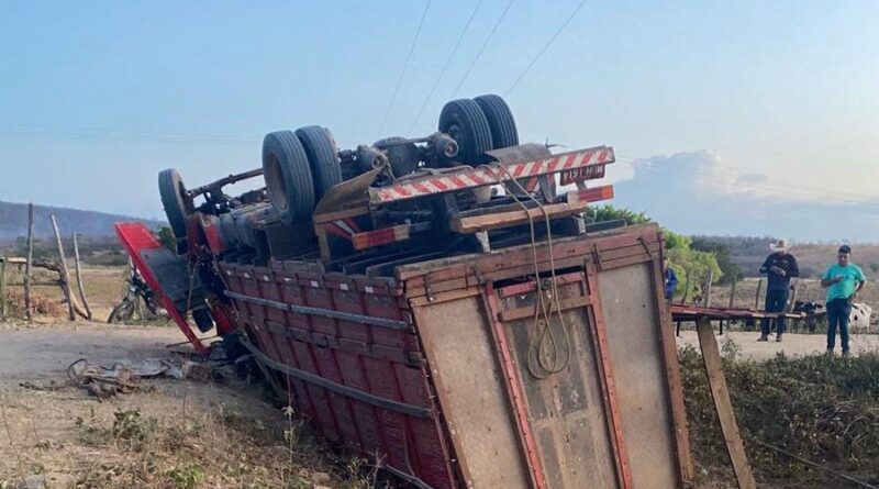 Um caminhão com nove cavalos tombou na tarde deste domingo, 24, em uma estrada vicinal no distrito de Canindezinho, em Várzea Alegre.