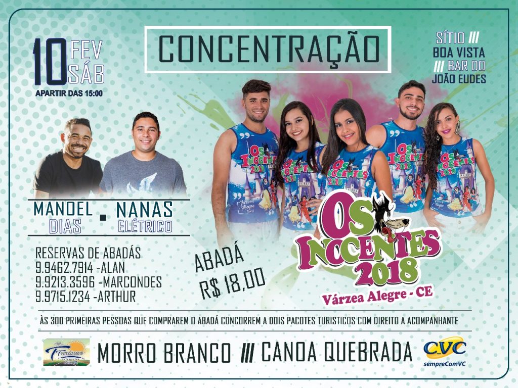 No dia 10, a partir das 15h, haverá uma concentração no Bar do João Eudes no Sítio Boa Vista. As primeiras 300 pessoas que que comprarem o seu abadá concorrerão a dois pacotes turísticos (Morro Branco e Canoa Quebrada).