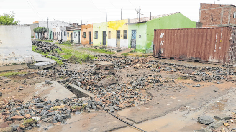 Um trecho da Rua Paulo Francileno Barbosa, próximo ao Centro, que passava por reformas para receber obras de saneamento básico, não resistiu à força da água, ficando completamente destruído. O buraco aberto deixou a via sem condições de tráfego. Segundo os moradores, a chuva começou por volta das 16h, se estendendo até à noite, sem muita trégua.