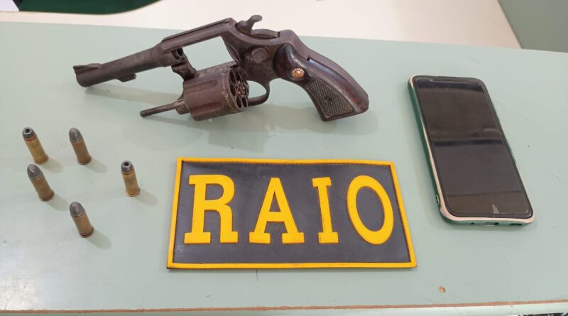 Durante as buscas foi encontrado um revólver marca taurus, calibre .38, capacidade para seis munições, municiado com cinco munições do mesmo calibre.