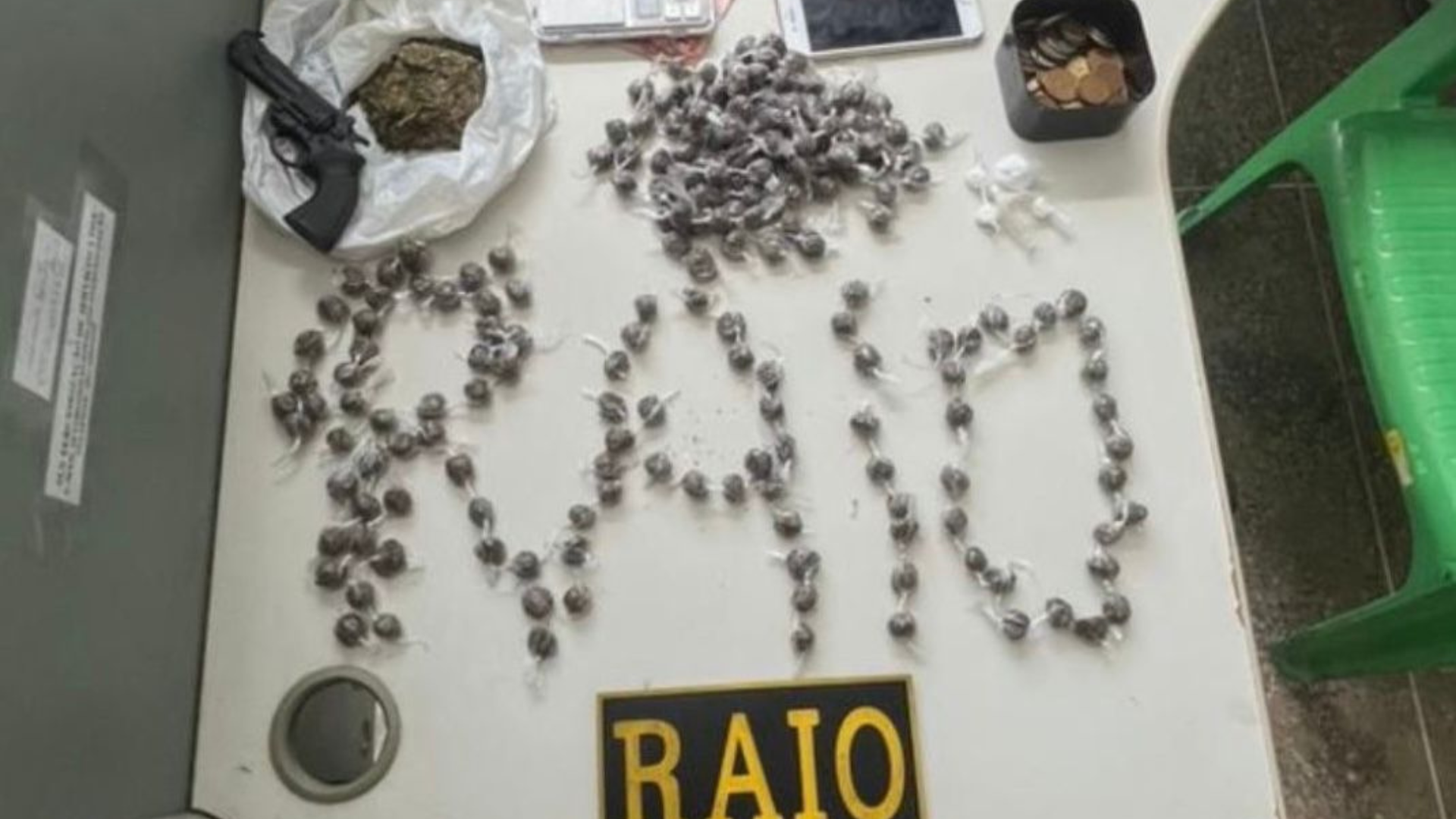 Os agentes de segurança encontraram embalagens de maconha dentro de duas geladeiras da casa e mais entorpecentes em um dos quartos, sendo eles maconha e cocaína, além de dinheiro trocado (R$153,60) e uma balança de precisão.