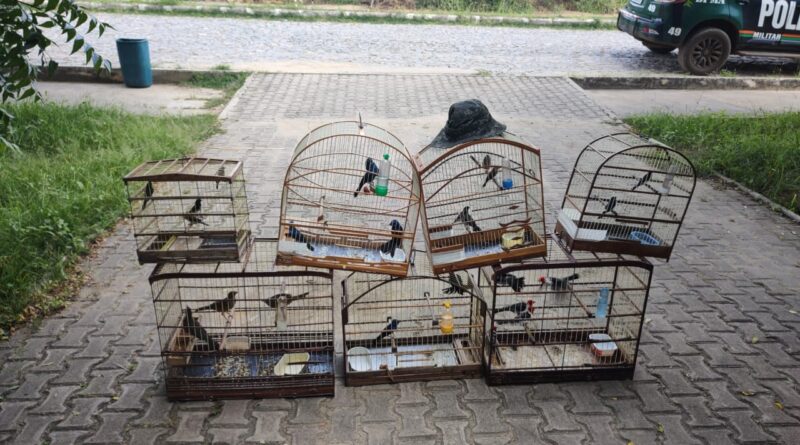 São seis pássaros da espécie azulão; um caboclinho; cinco galos-de-campina; três sabiás; um golinha; três bicos de prata; um abre-e-fecha e três da espécie caretinha, que foram encontradas na rua das Lavadeiras.