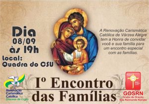 É que a Renovação Carismática Católica – RCC da cidade junta as Pastorais da Paróquia de São Raimundo Nonato, estará promovendo o I encontro com as famílias no intuito de despertar a importância da oração e a união familiar.